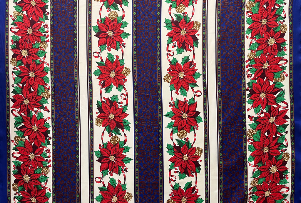 Bring a touch of elegant holiday charm to your projects with Midnight Poinsettia Stripes. Bold crimson poinsettias and pinecones are beautifully framed by festive ribbons and deep navy panels, creating a striking striped design. Perfect for table runners, holiday quilts, tree skirts, or festive home décor, this fabric blends classic Christmas colors with a rich, sophisticated twist.