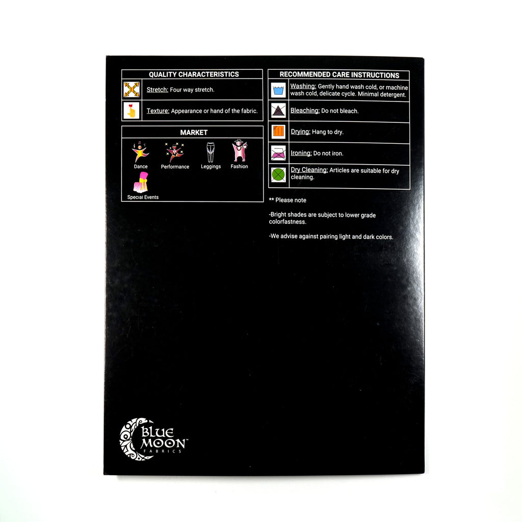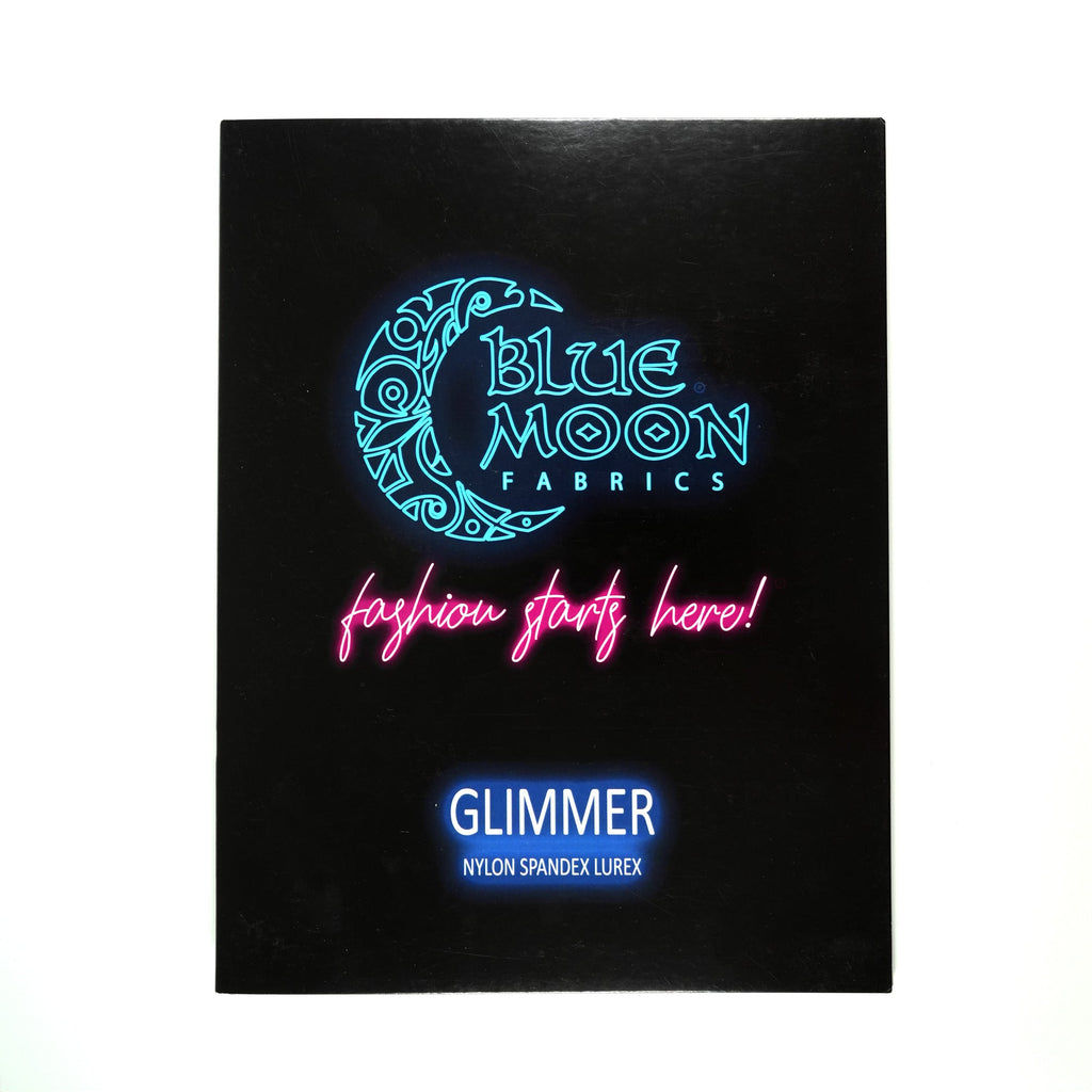 The Blue Moon Fabrics Glimmer Nylon Spandex Lurex Color Card includes cut swatches of all 30 Colors of our Glimmer Nylon Spandex Lurex. With their smooth texture, opaque nature, and soft stretch backing, these fabrics are excellent for dance, swimwear and couture, as well as form-fitting fashion. The combination of metallic Lurex fibers and the soft spandex backing provides an optimal balance of stretch, flexibility, and durability.