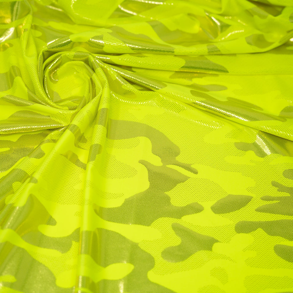 Neon Nugi Foil Printed Cationic Spandex features a stylish metallic camouflage foil print on a high-quality 4-way stretch polyester spandex tricot. With their chic foil print and medium-weight stretchy base, these fabrics are ideal for dancewear, as well as activewear and athleisure fashion. This fabric is designed for durability and performance, with its 4-way stretch, quick-drying and breathability to keep its wearer comfortable throughout the day.