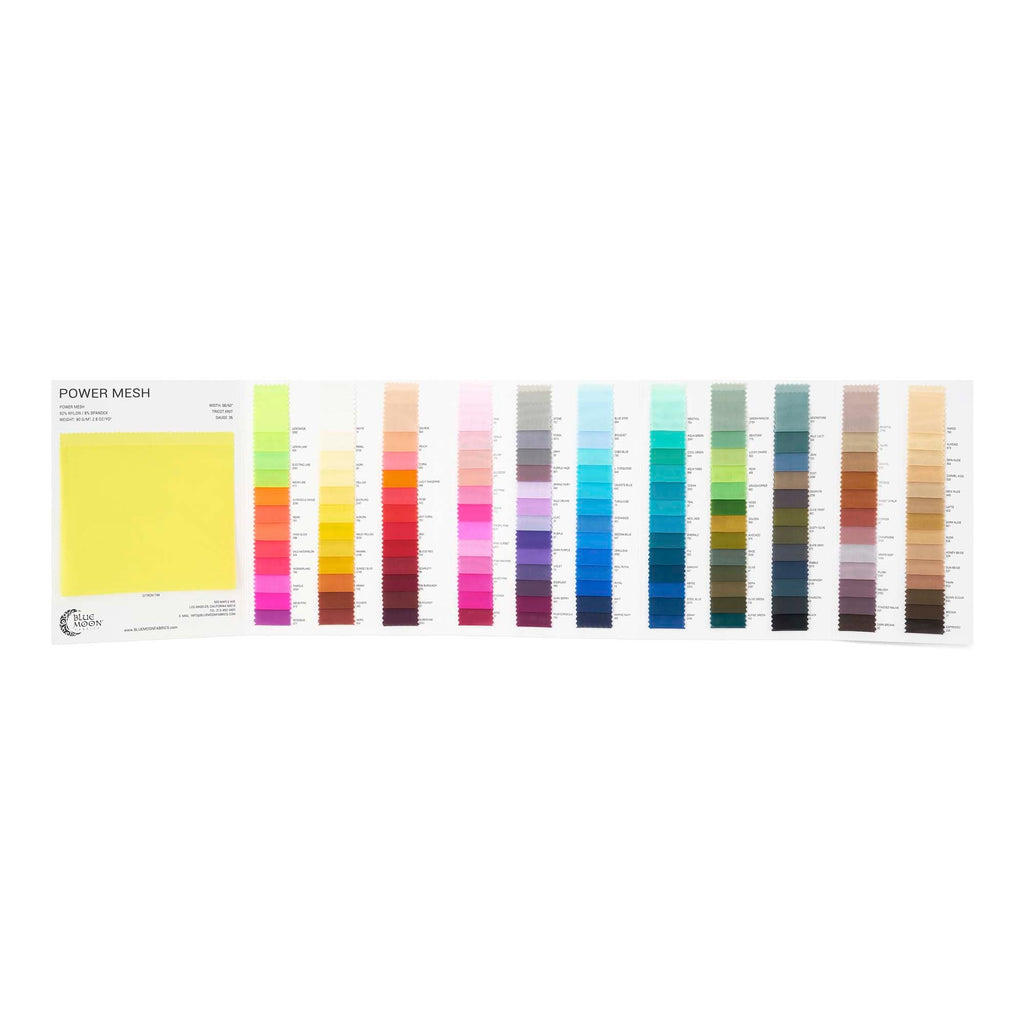 The Blue Moon Fabrics Power Mesh Color Card includes cut swatches of all 139 Colors of our Nylon Spandex Power Mesh. It's an essential tool for any wardrobe designer looking to find the perfect color palette for their project needs. All 3 Collections: Classic, Nudes & Neutrals, and Neons are included. Power Mesh is a 4-way stretch fabric ideal for swimwear, performance costumes, and athleisure fashion.