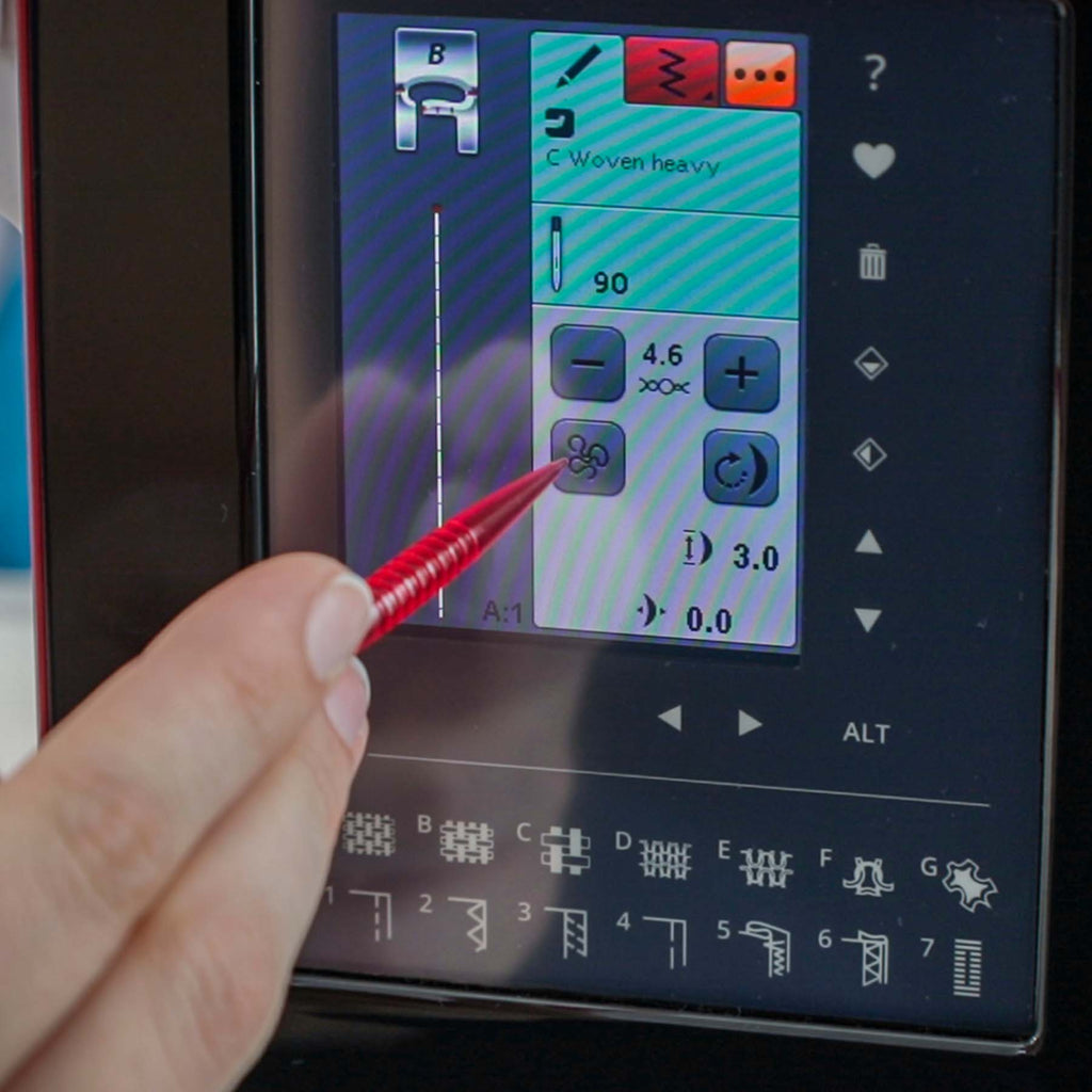 Select your type of fabric and sewing technique and the Exclusive SEWING ADVISOR® feature instantly sets the best stitch, stitch width, stitch length, thread tension, presser foot pressure, and sewing speed for you. The stitch is displayed with the recommended presser foot, needle size and type on the screen.