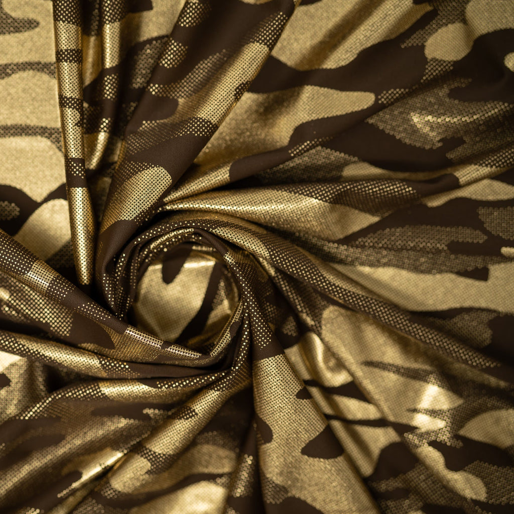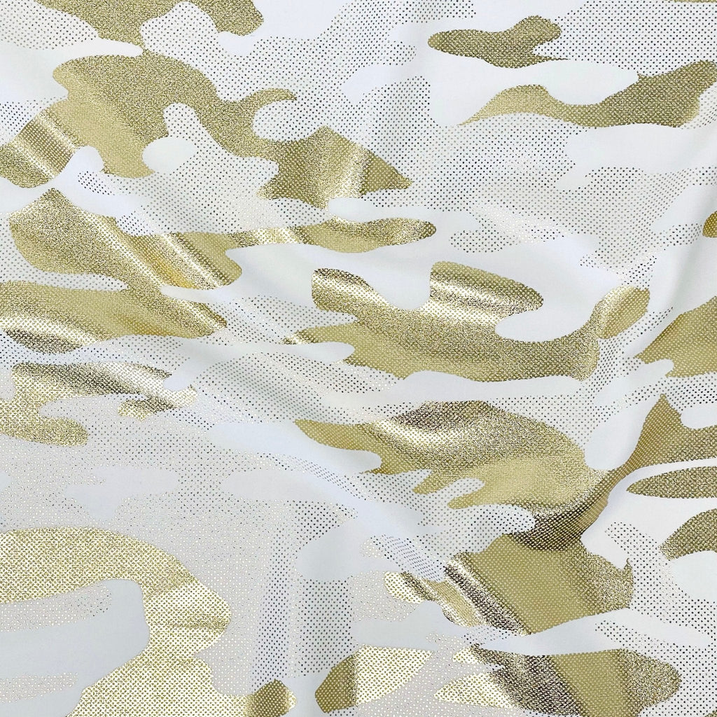 The Nugi Foil Printed Spandex collection features a stylish metallic camouflage foil print on a high-quality 4-way stretch nylon spandex tricot. With their chic foil print and medium-weight stretchy base, these fabrics are ideal for dancewear, as well as activewear and athleisure fashion. This fabric is designed to stand up to rigorous activities, making it the perfect choice for athletes and fashionistas alike. Its durable construction ensures that you can move with confidence in any situation. The fabric is machine washable and colorfast, making it ideal for everyday wear. It provides an excellent fit and holds its shape even after rigorous activities.